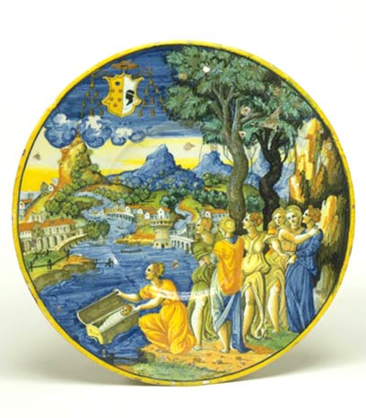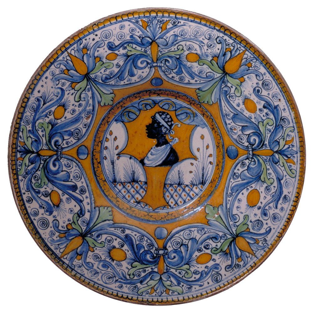 The plate to the right has a shield with a Moor's head as its centrepiece. Set against a yellow background, the dark colour of his skin contrasts with the white headband and kerchief he wears around his neck. As any number of families used the device, perhaps as a pun on their surnames, it is unclear who may have commissioned the plate.