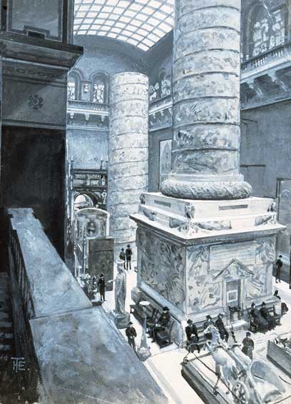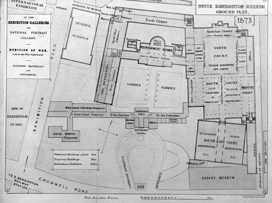 The Architectural Courts (now Rooms 46a, 46 and 46b) were to occupy part of the site of the Boilers and be an extension of the permanent buildings that now ran south from the Sheepshanks Gallery. Consisting of two huge halls (41 metres long and 25 metres high) running north-south and separated by a narrow three-storey gallery, the space was designed to contain the Museum's collection of large-scale architectural features, such as Trajan's Column. Both courts were open by the summer of 1873.