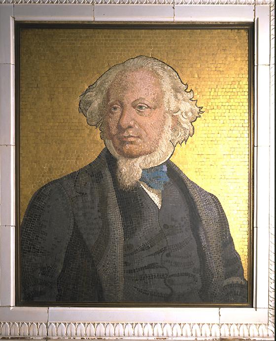 The monument to Henry Cole installed on the landing in 1878 is by Florence Cole, his niece. This mosaic portrait is a very appropriate testament to an extraordinary Victorian character.