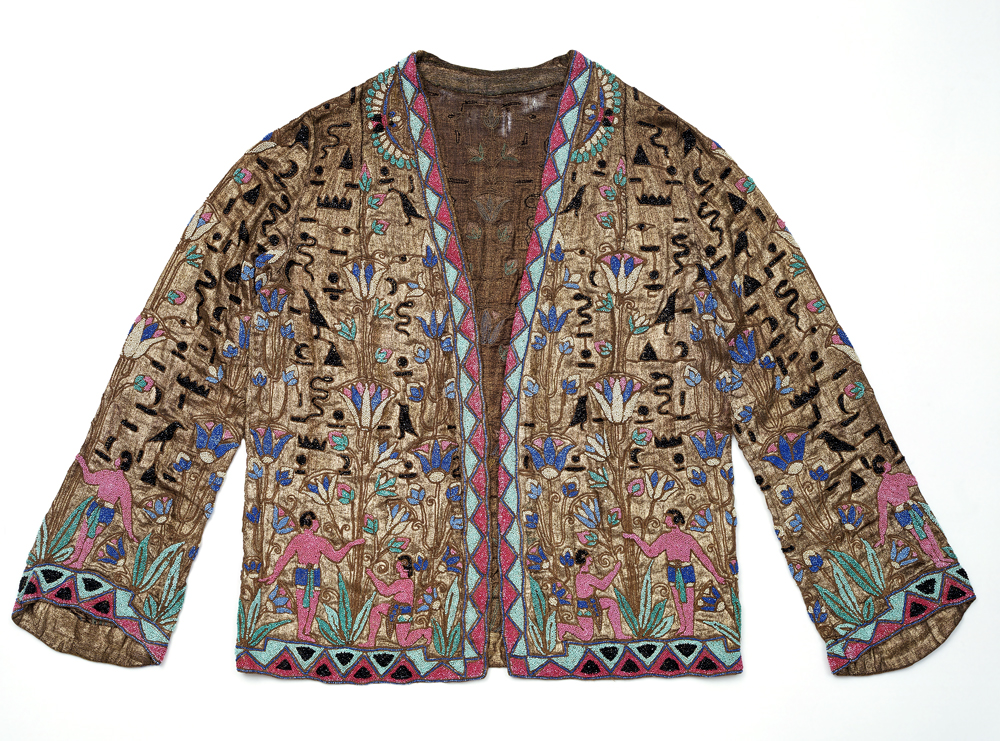 Egyptian imagery such as lotus flowers, scarabs, hieroglyphics, pylons and pyramids were particularly popular motifs and appeared in many forms of decorative arts, as can be seen in this exquisite evening jacket