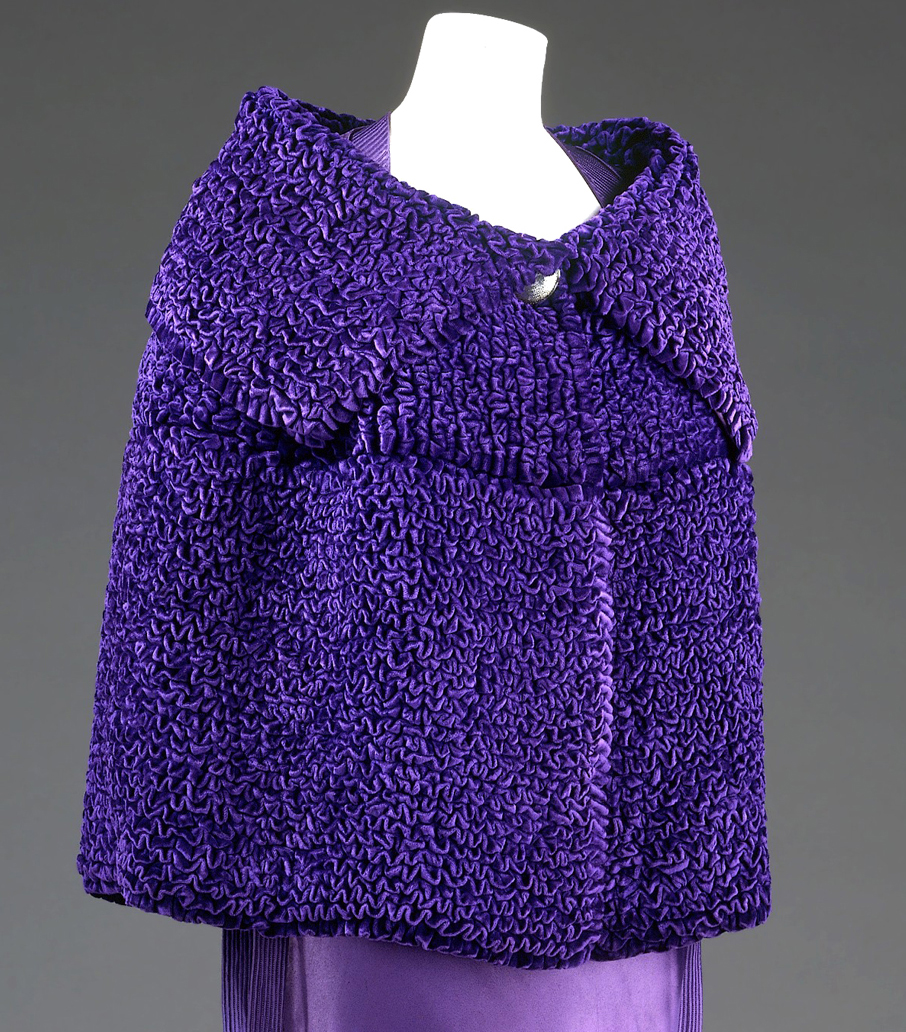 The cape is made of silk velvet which has been ruched to achieve the effect of Astrakhan fur. The dense and intricate optical effects of the velvet enhances the purity of the dress' satin. This cape is a very good example of Lanvin's consummate knowledge of fabrics and of her characteristic love of textures.