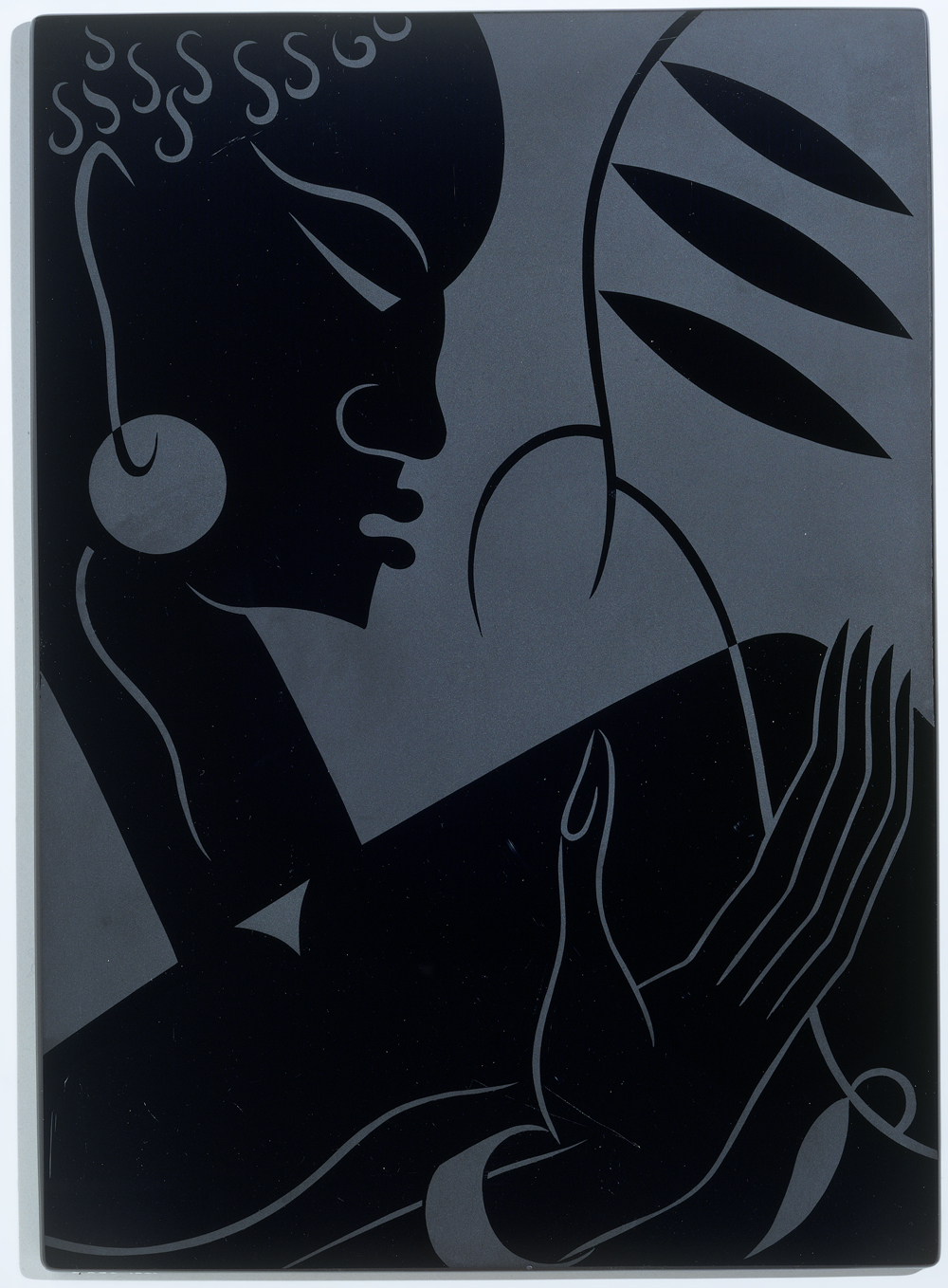 Tile, Sigmund Politzer, sand blasted black and grey glass, Made by Pilkington Ltd. 1933-1938. Museum no. C.230-1991
