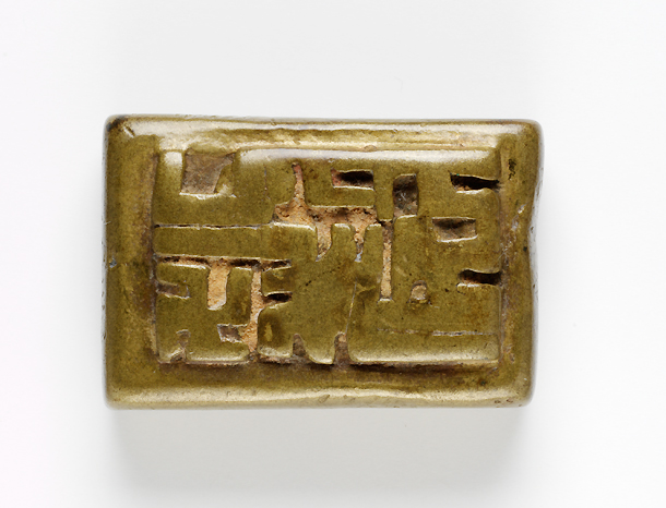 Goldweight, Asante (Ashanti), Ghana, 19th century. Museum no. CIRC.236-1971. Weight in the form of a plain rectangular block of brass with a worn raised geometrical pattern.