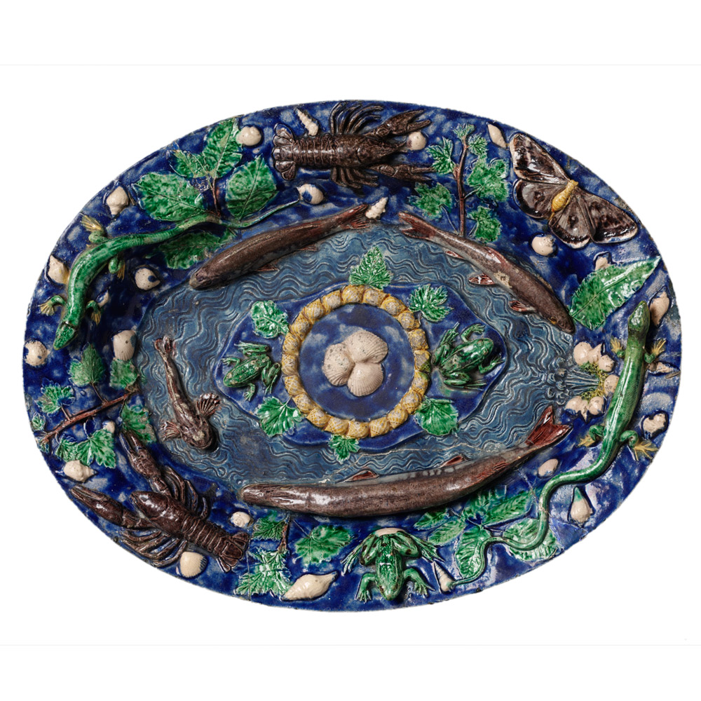 Dish, Joseph Landais, Tours, France, about 1855. Museum no. 2815-1856. Enamelled earthenware. In the mid-19th century the work of Bernard Palissy was rediscovered and it became very popular. This encouraged a number of French potters to produce copies. They were at least as good as the originals, and often much more elaborate.