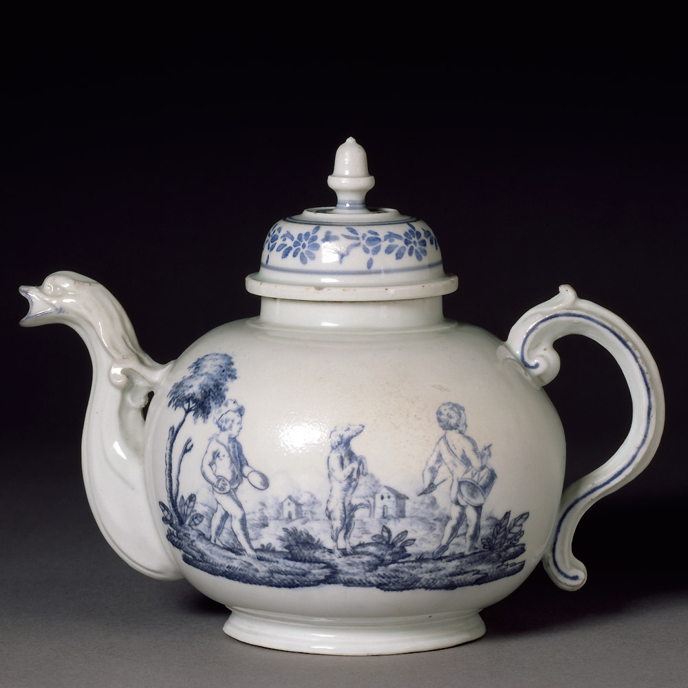 Teapot, Doccia porcelain factory, 1742-1745. Museum no. C.407-1928. Hard-paste porcelain with transfer-printed figures, hand-painted background and stencilled decoration. As early as the 1740s the Doccia factory in Italy experimented with transfer-printed and stencilled decoration. But it was in England that the technique was fully exploited on porcelain, notably at Worcester and Caughley in the second half of the 18th century.