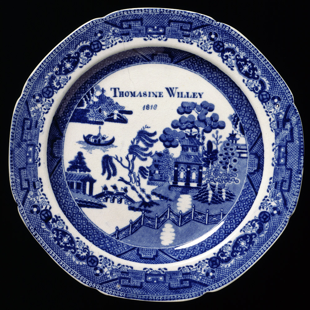 Plate, Spode Ceramic Works (possibly), Staffordshire, England. Museum no. C.231-1934. Probably a dessert plate, this transfer-printed willow pattern plate differs little from thousands being made by many factories in Staffordshire and elsewhere from the early 19th century onwards.