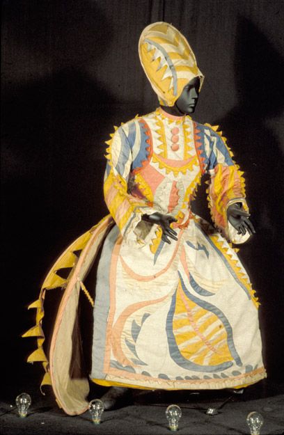 In Allegory he merged the dancer, shape, light, colour and sound in a new realisation of abstract dance. The Finials sequence represented the ultimate in dehumanizing the performer - the costume is not dictated by the shape of the body but gives shape to it so that the dancer becomes an abstraction in an overall scheme.