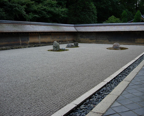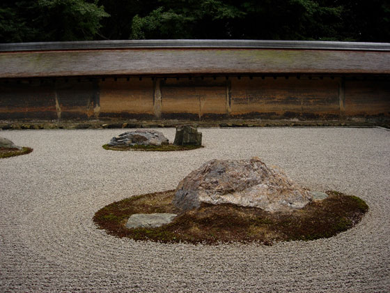Perhaps the most well-known Rinzai centre in Kyoto is the nearby temple of Ryoanji, (Temple of the Peaceful Dragon). Ryoanji was built in 1450 by the general Hosokawa Katsumoto who, hoping to revive the declining fortunes of the Myoshinji, invited its fifth abbot to take up residence there. Ryoanji is renowned for its dry stone garden, reputedly the work of the artist Soami (c.1455-1525) which is used as a focus for Zen meditation. The garden, enclosed by stone walls on three sides and a veranda on the other, comprises fifteen moss-covered boulders of various sizes surrounded by areas of raked gravel. The arrangement resembles a seascape of groups of islands rising out of the sea. They are placed so that when looking at the garden only fourteen of the boulders are visible at one time. Tradition says that only through attaining enlightenment would one be able to view the fifteenth boulder. The custom of creating Zen-influenced dry landscape gardens began during the Muromachi period (1336-1573).