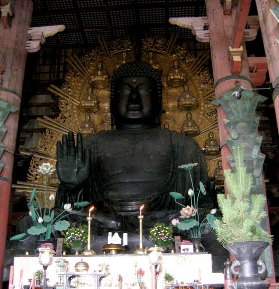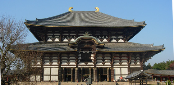 Buddhism was introduced to Japan in 552 AD. During the 8th century, a number of temples and shrines were constructed in Nara including the huge temple of Todaiji (Great Eastern Temple), commissioned by Emperor Shomu (ruled 724-49). Todaiji had been destroyed by fire and re-built several times but the Great Buddha Hall (Daibutsuden) of the current building is still the largest wooden structure in the world and contains a colossal bronze statue of Vairocana, standing 15 metres high weighing around 400 tonnes. Other important temples and shrines in Nara include Saidaiji, Kofukuji, Gangoji, Yakushiji, Toshodaiji and Kasuga shrine.
