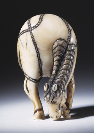 Museum no. 418-1904The netsuke is a toggle. Japanese men used netsuke to suspend various pouches and containers from their sashes by a silk cord. Netsuke had to be small and not too heavy, yet bulky enough to do the job. They needed to be compact with no sharp protruding edges, yet also strong and hard-wearing. Above all, they had to have the means for attaching a cord. Netsuke were made in a variety of forms, the most widely appreciated being the katabori (shape carving), a three-dimensional carving, such as this one in the form of a grazing horse. The most widely used materials for making netsuke were traditionally ivory or wood. Throughout the Edo Period (1615-1868), ivory from the Indian elephant was imported by Chinese and Dutch traders. Owing to the cost of the material, a small piece of ivory would be used to maximum effect. The subjects of netsuke were often originally suggested by the shape of a particular material, as with this grazing horse. In time, however, this particular subject became a standard one used by numerous carvers over a long period of time.