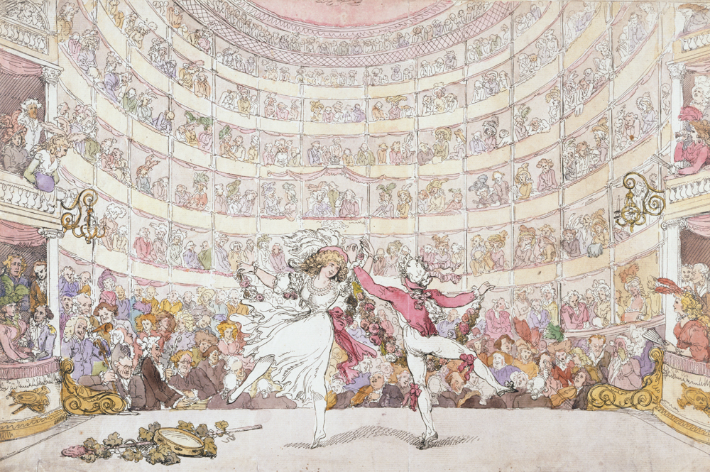 'The Prospect Before Us, Charles Louis Didelot & Mme.Theodore in Dauberval's ballet Amphion et Thalie', hand-coloured etching by Thomas Rowlandson, London, England, 1791. Museum no. HBf.81-60 Beard Collection