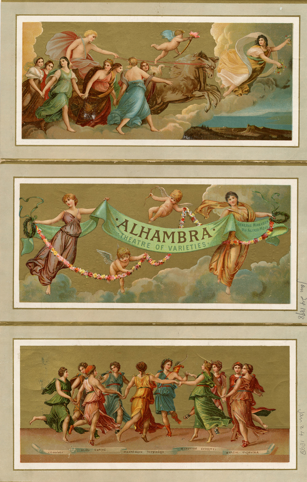 By the end of the 19th century, ballet was a popular draw at the rival Alhambra and Empire theatres which stood on adjoining sides of Leicester Square, in London. These were full-scale ballets, and both theatres spent a great deal of money on bringing in famous dancers from abroad. Some of the ballets had topical and contemporary themes. Our Crown was choreographed for King Edward’s coronation and others had light-hearted themes such as Seaside and High Jinks.