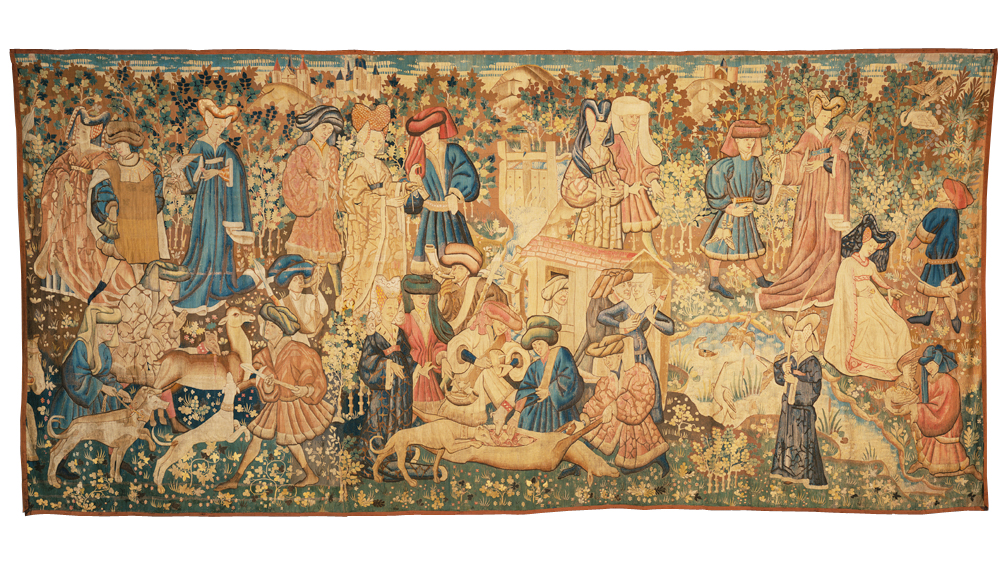 The importance of the Devonshire Hunting Tapestries does not lie in the name of the original owner, nor in the identity of designer or workshop, all of which are unknown. The very survival of tapestries of this scale and quality of design is rare enough from this period to ensure their fame. They were made at a time when Arras was still supplying the courts of France and Burgundy with the magnificent hangings known to us now only from records in accounts and inventories.