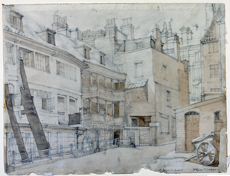 Sketch of the George Inn, Southwark, by Phyllis Ginger (1907-2005), pencil and wash on paper, London, c1940-1960, given by Paul Durbin and Eleanor Durbin. Museum no. E.321-2007