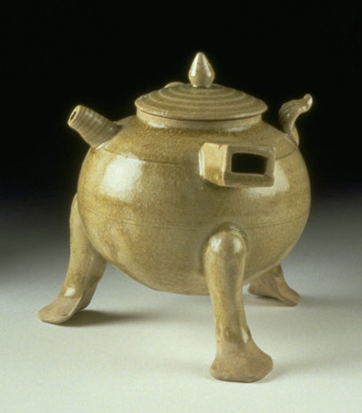 The potters who made these wine-warmers sometimes added tails and beast-like heads or faces to the pot, or by giving the tripod legs hooves or paws.