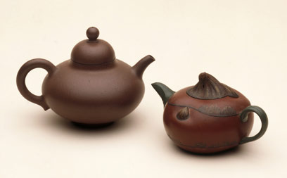 Teapots, 1650-1660 and 1984. Museum nos. C.871-1936, FE.31-1984. These two teapots were made at the same kiln site at Yixing. The local clays there are cream, red or a warm brown. The teapot on the left was made by the potter Hui Mengchen sometime between 1650 and 1660. The one on the right in the shape of a water chestnut was made in 1984 by the woman potter Jiang Rong.