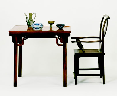 Table and chair set with a jade ewer and stemcup, a porcelain-lidded food box and a porcelain bowl. Ming dynasty (1368--1644).