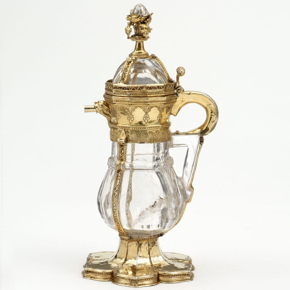 Until the 14th century, objects in rock crystal were imported into Europe ready-made from the Islamic world. European admiration for these objects, and for the clarity of the crystal they were made from, was so great that, around 1300, the French began to import the raw material from the Islamic world, and to carve their own versions. These copied the pear-shaped form of the Egyptian ewers, but their surface decoration was never as elaborate as the Islamic objects. Instead, decoration was concentrated in the silver-gilt mounts, which here feature Gothic ornaments in the most fashionable style.