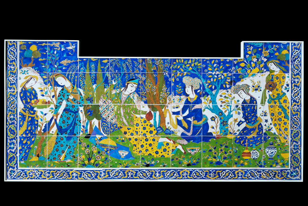 Panel of glazed earthenware tiles depicting a picnic scene, said to have come from the Chihil Sutun (Forty Columns) Palace of Isfahan, Iran, 17th century. Museum no. 139:1-1891