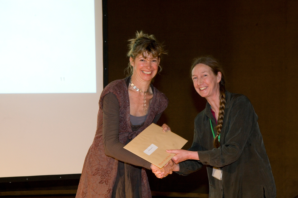 Jackie Wamaitha on behalf of Laura Caiafa receiving the Word and Image book prize from Marilyn Greene on behalf of Barbara Lasic