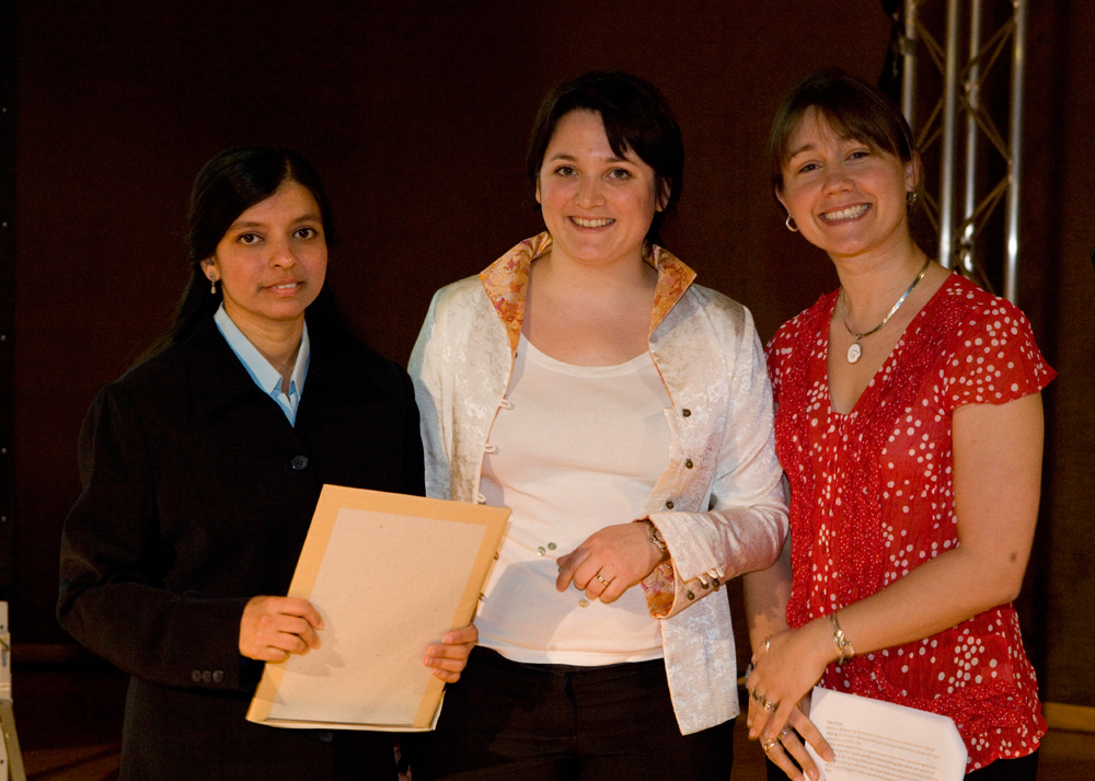Avantika Katoria receiving the ceramics award from curators, Melanie Vandenbrouck-Przybylski and Amy Mechowski
