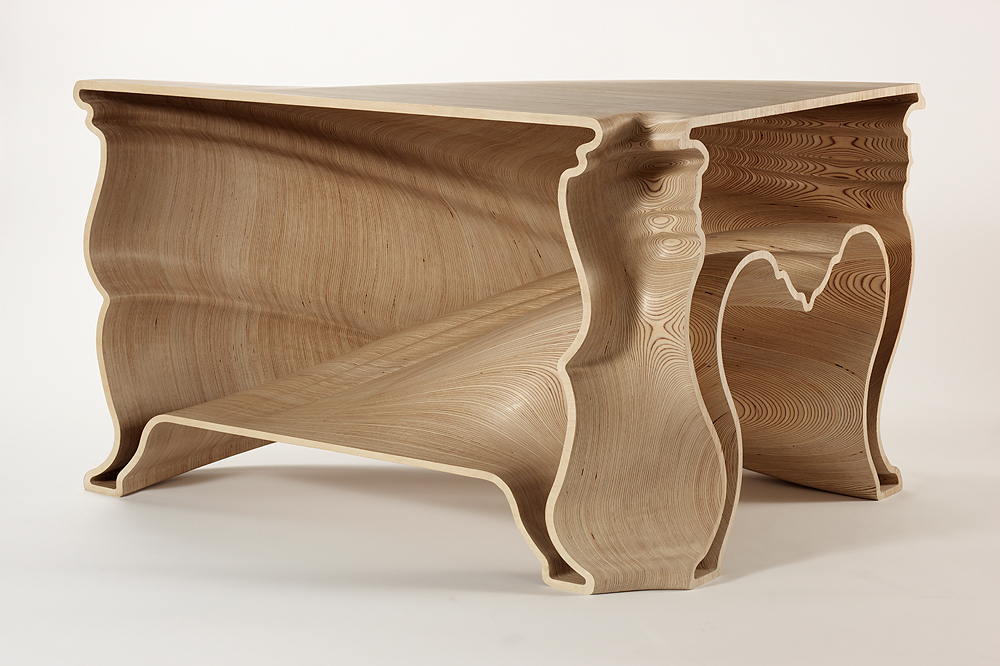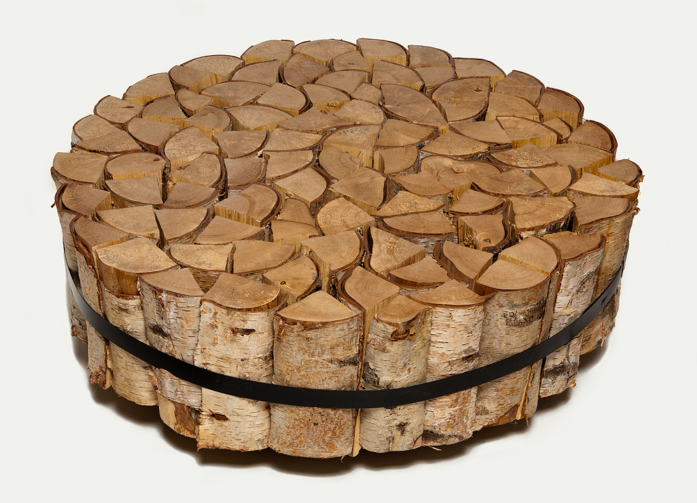 ‘When I saw the table, I was struck by the tension of the logs constrained by the steel band. The idea that the logs had been captured for an industrial man-made use made me want to cut the band and set them free. Then I saw a vase called Trees in the Mist and the design inspired me to make the logs go back and join the forest.’