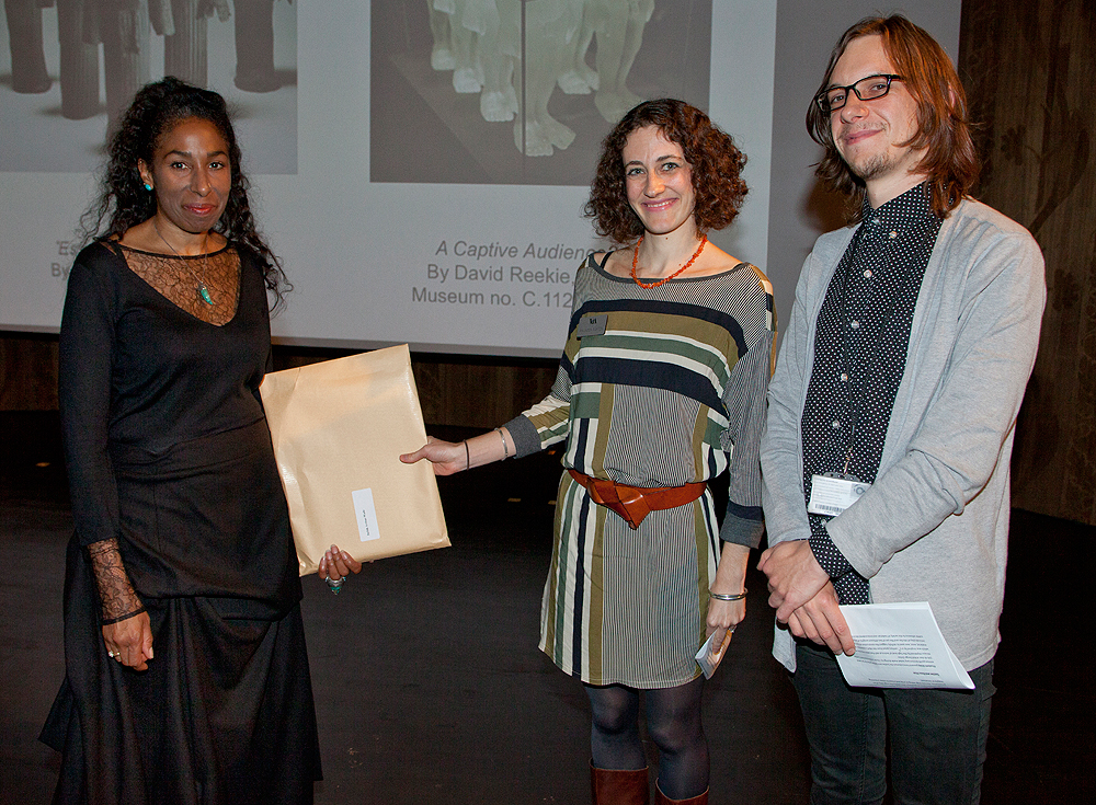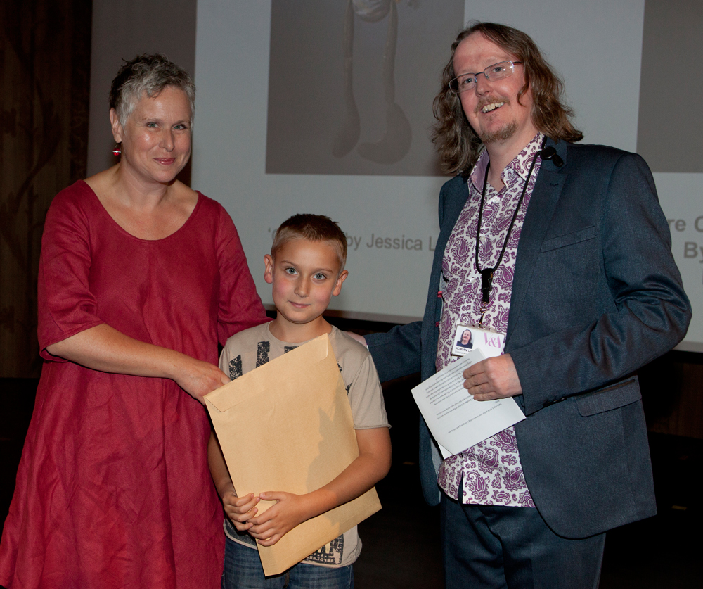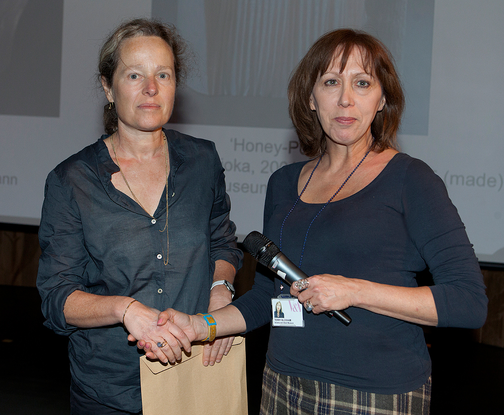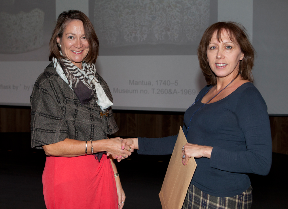 Louisa Taylor, 2012 V&A Artist in Residence, presents Anna Silverton and Catherine White, tutors from Westminster Adult Education Services, the award for the most inspiring college
