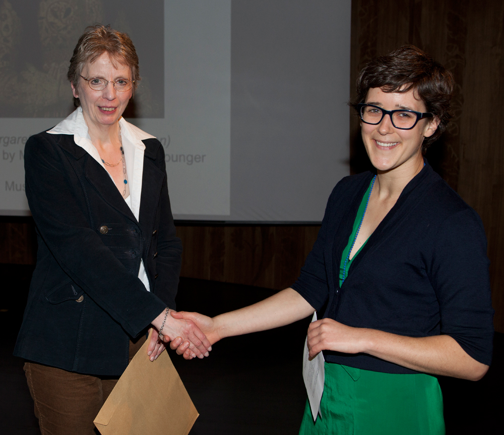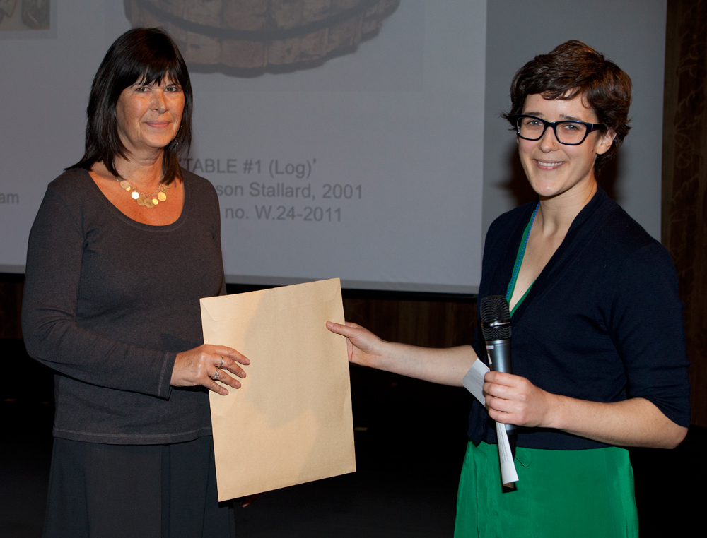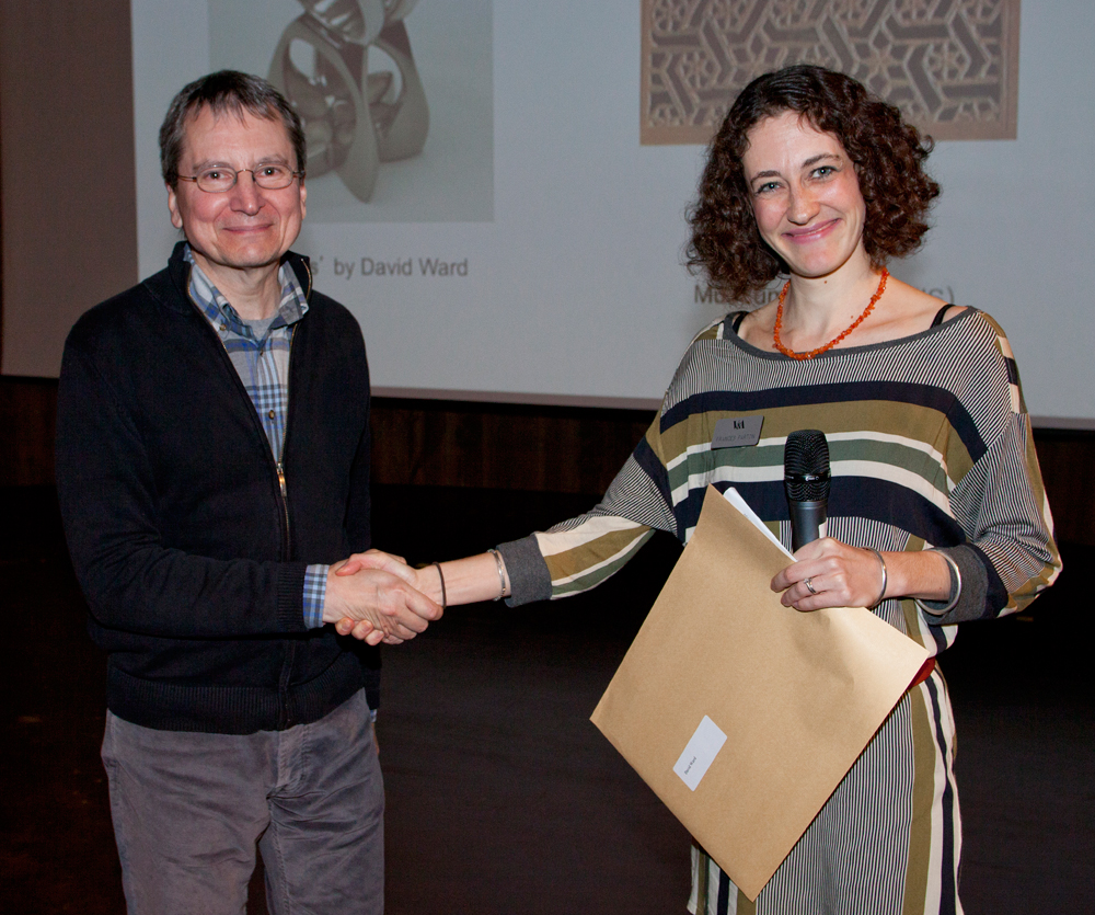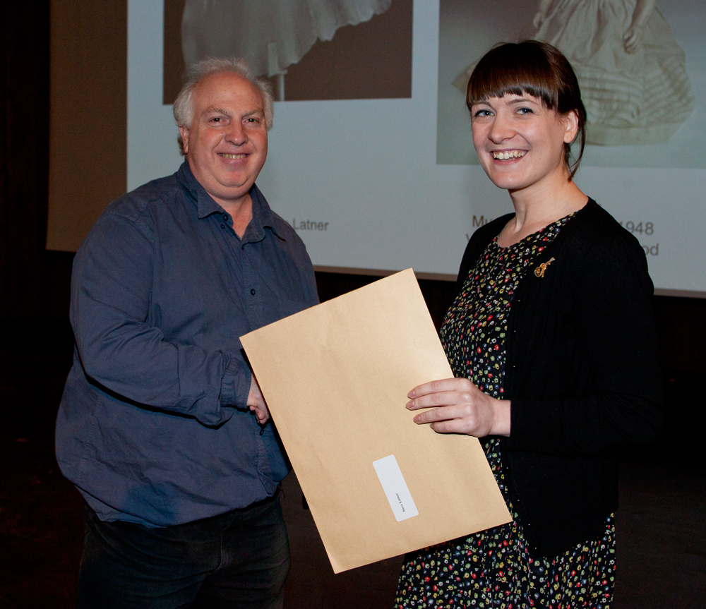 Louisa Taylor, 2012 V&A Artist in Residence, presents Anna Silverton and Catherine White, tutors from Westminster Adult Education Services, the award for the most inspiring college
