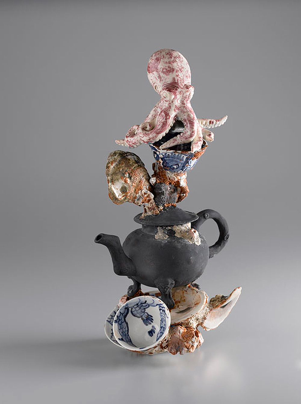 ‘Dennis Groenhuysen has shown great inspiration from a number of objects in the V&A collections and incorporated these ideas into his own concept of Home in a truly aesthetically pleasing, tactile and well crafted manner. His main inspiration is Michelle Erickson’s “Octopus Junk” which shows the barnacle encrusted teapot and ship wrecked ceramics which have become home to an octopus, yet he has made a calm stack of symbols that represent the comfort, beauty and familiarity of his home in Canada. Dennis clearly has gained great confidence from attending adult education classes and overcome many challenges to achieve this very intriguing and innovative work of art.’
