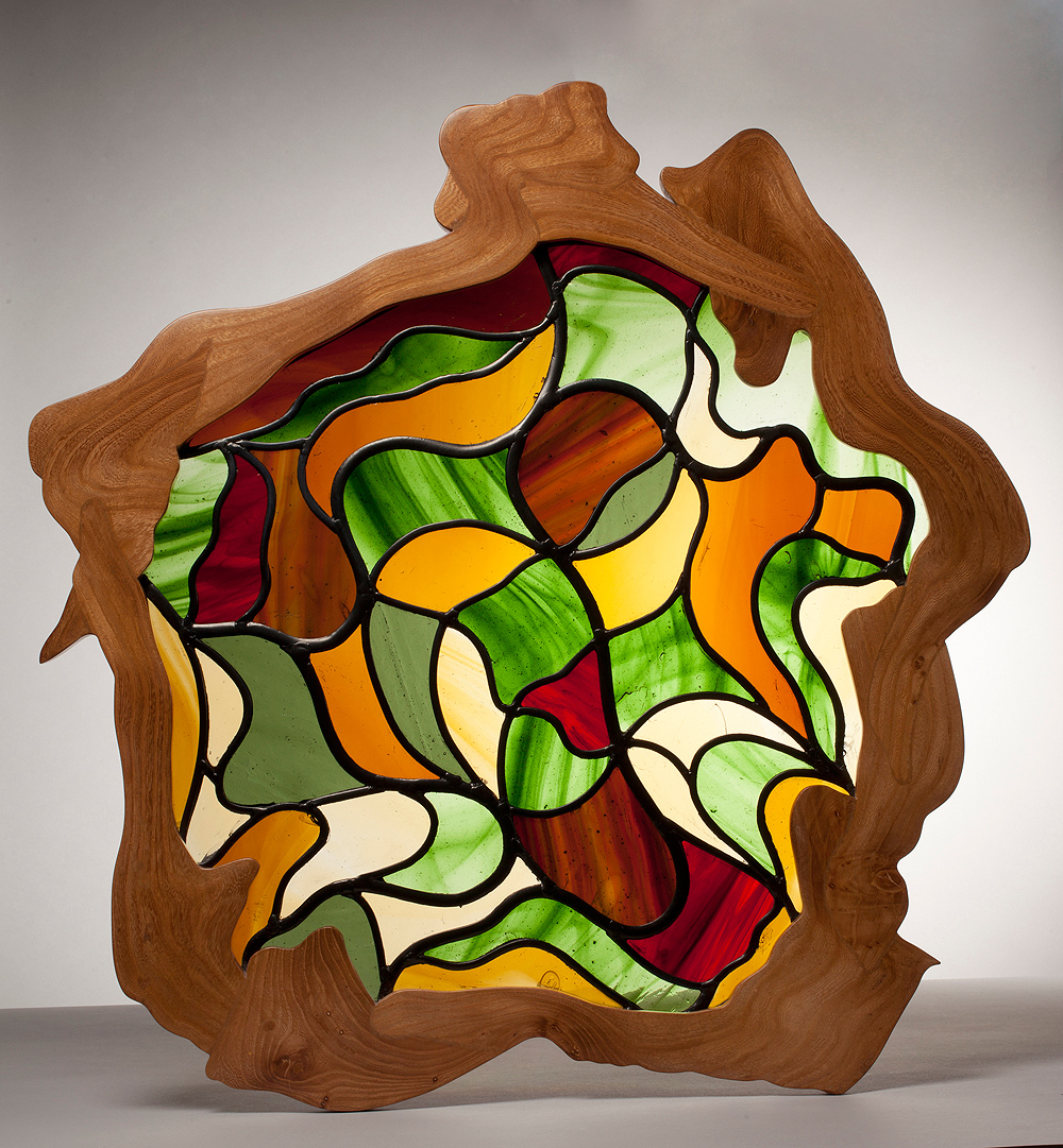'Caroline Platt has created a framed coloured glass panel. Her artistic choice of colours and arrangement delight the eye and her lead-working shows a solid understanding of the medium. The frame she has created is an organic celebration of the beauty in wood grain and is an outstanding complement to the glass it contains.'