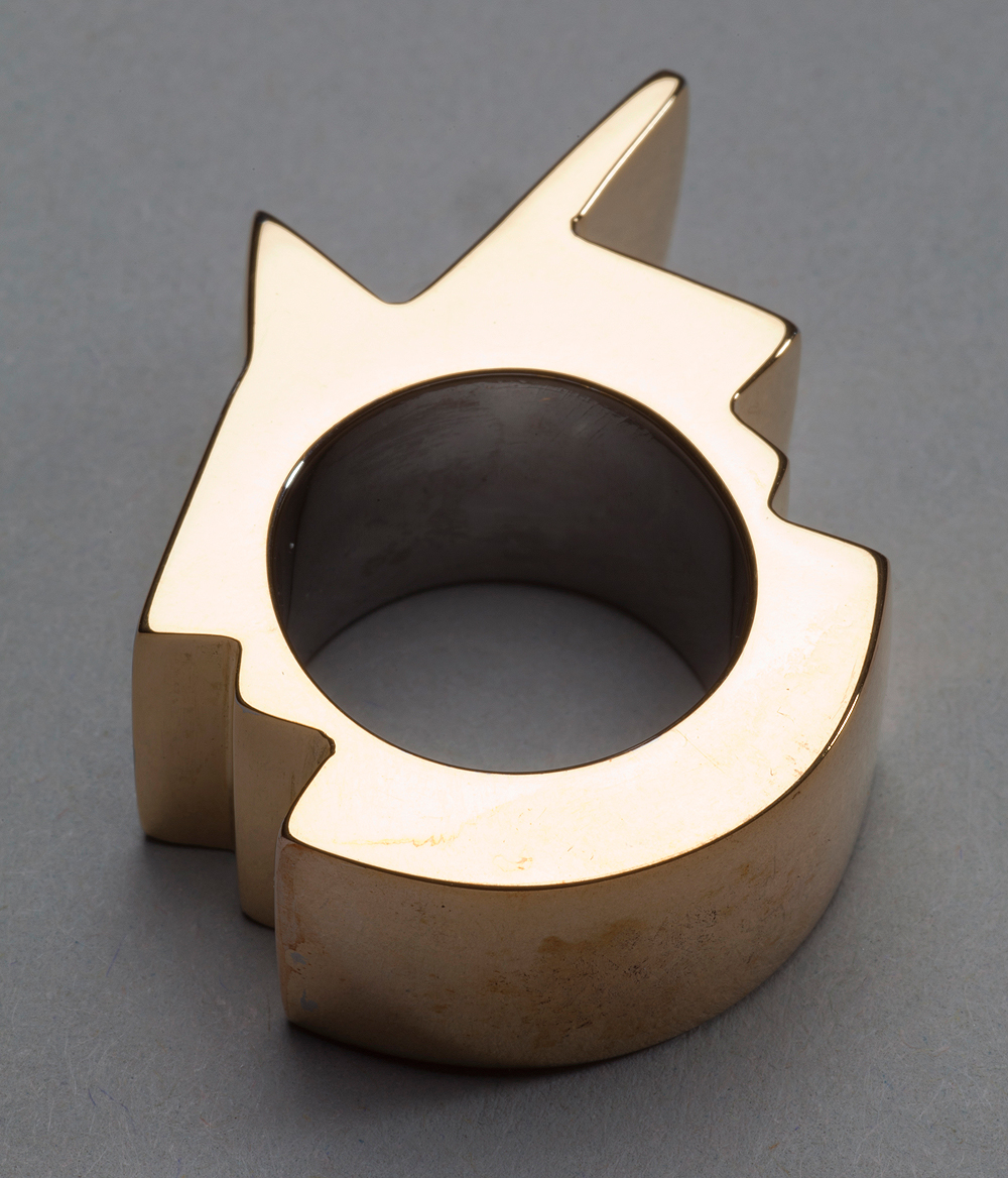 ‘Inspired by the Cross Head sculpture, I wanted to design a ring that conveyed its strongest aspects. In particular the tension between its solidity, clean lines, weight, angular geometry facets and prism-like properties. I also utilised black and gold to depict its luminosity.’