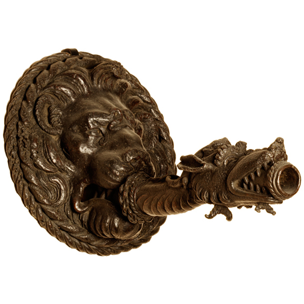 Perhaps fed from a cistern above, the bronze mask and pipe from the Ducal Palace at Lucca channelled water to fall clear of a wall, probably into a basin below. The coupling of a lion and a grotesque serpent brings together two decorative motifs associated with Roman antiquity.