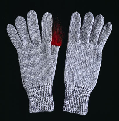 Freddie Robins's subversive knitting includes a series of gloves where pairs join, single gloves have ten fingers or each finger sprouts a new glove.
