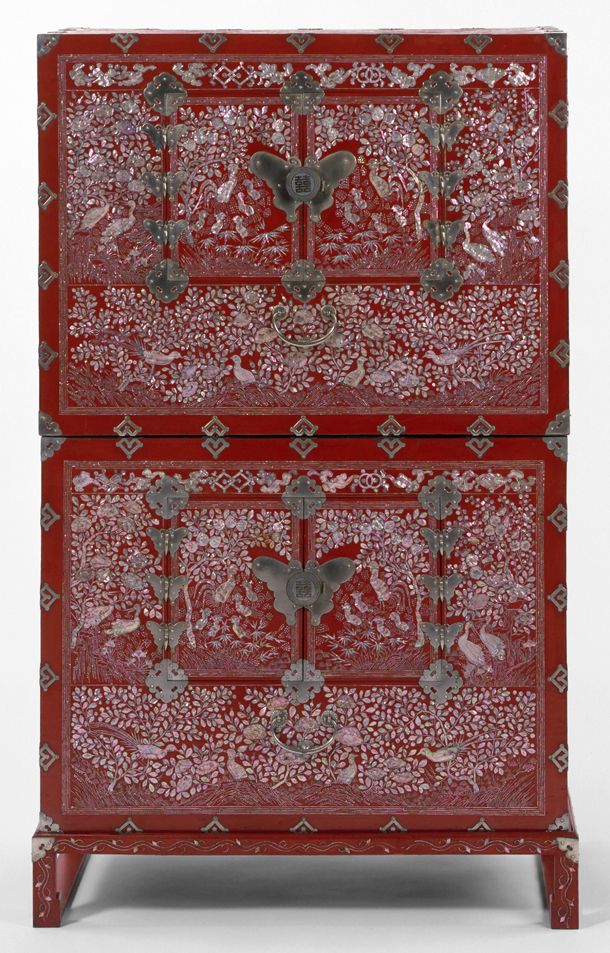 The red lacquer chest is comprised of two boxes which stack one on top of the other and a separate stand. The stand protected the base of the lower chest from heat radiating from the traditional underfloor heating system, known as 'ondol', found in a Korean house. The red lacquer is lavishly covered with inlaid mother-of-pearl decoration. Phoenixes, cranes, peach trees and fish are depicted as well as stylised butterfly-shaped decorative metal fittings. Such a brightly coloured chest decorated with auspicious motifs would typically have been found in the female quarters of a wealthy Korean home. The chest was used for the storage of clothes and bedding. Until the last decades of the 19th century, red lacquer furniture was strictly confined to royal usage but as restrictions on sumptuary laws loosened, red lacquer items became more widely available.