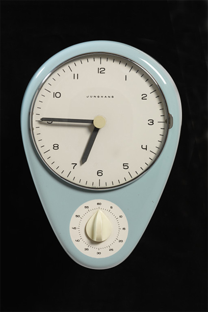 This kitchen clock, which incorporates a mechanical timer, was designed by Max Bill whilst Director of the Hochschule für Gestaltung (HfG Ulm), the experimental design school founded in 1953.