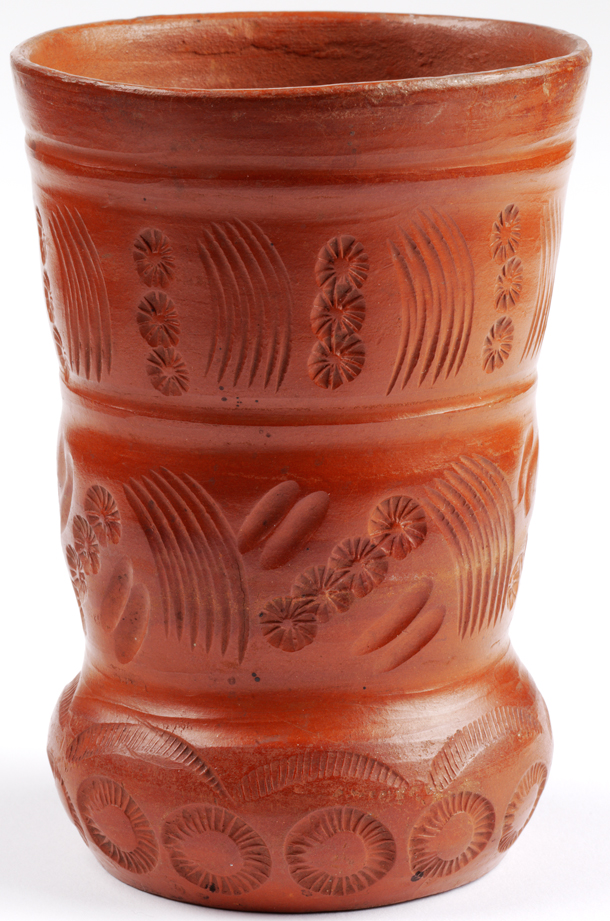 Smaller beakers are often characterised by punched, stamped and incised decoration. These delicate vessels appear in many 17th century Spanish still-life paintings, demonstrating that búcaros were as prized as oriental porcelain or fine glass. Contemporary sources record their use in flavouring water at banquets. They were also thought to purify polluted water and even detect poisoned liquids.