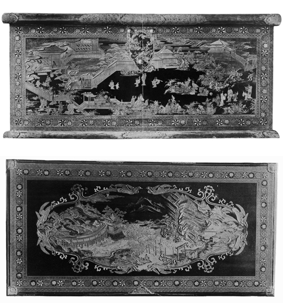 ケント州チディングストン城This large and elaborate casket in Renaissance form shares many features with the Mazarin Chest and other examples of high quality Japanese export lacquer produced during the 1630s and early 1640s (see in particular the V&A’s casket in Renaissance form, which is more modest in scale but comparable in terms of sophistication of production). Its decoration includes what appear to be references to the Tale of Genji, but because these are confined to small areas, it is difficult to identify the specific chapters to which they allude.