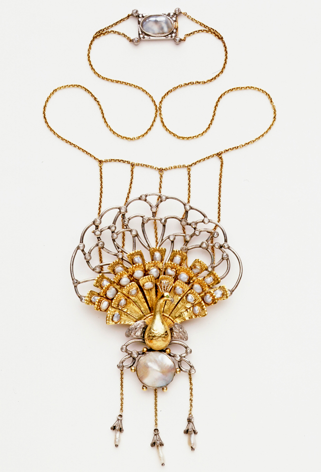 Colette's poem was inspired by a peacock-shaped necklace designed in 1901 by Charles Robert Ashbee (1863–1942), one of the earliest Arts and Crafts jewellery designers. Ashbee believed that the value of jewellery lay in its design, not in the monetary value of the materials used. Although this peacock jewel is one of his more sumptuous creations, it would have been modest in price compared with the heavy, diamond-set jewellery of other designers of the period.