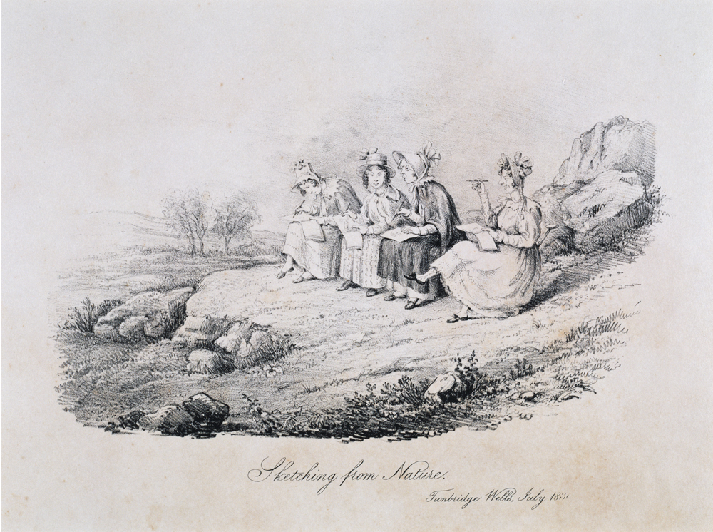 The V&A’s splendid British Galleries opened in 2001 and the Museum is continuing to add to its historic British collections. Figure 1, The Royall Oake of Brittanyne, shows a diabolical Oliver Cromwell supervising the hacking down of a tree symbolising the British monarchy. The print will be going into a Civil War topic box available to V&A visitors in the Prints & Drawings Study Room. Topic boxes are a selection of prints and drawings on a particular theme. They can be seen in the Prints & Drawings Study Room, where works that are not on display are available to visitors. A topic box about drawing is the likely destination of lithograph in figure 2. Entitled Sketching from Nature, Tunbridge Wells, 1830, it makes fun of the early 19th-century fashion for ladies taking up drawing outdoors as a hobby.
