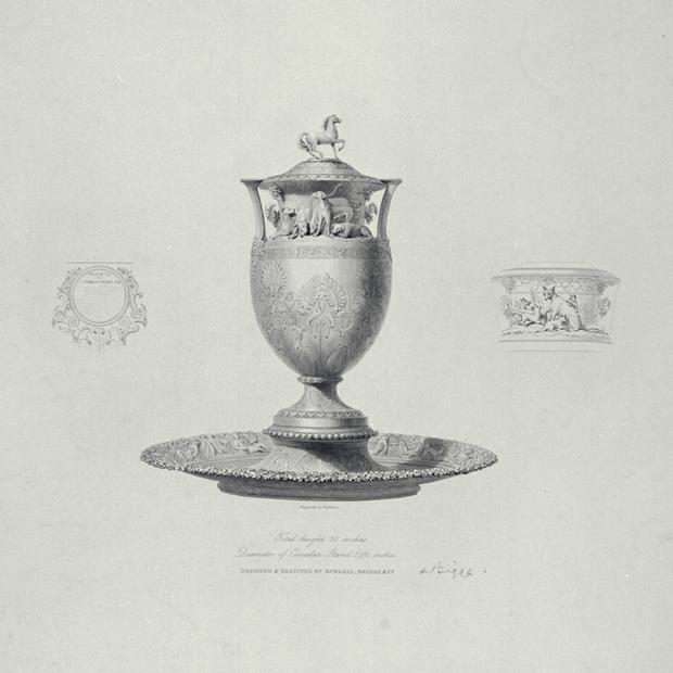 The V&A is famous above all for its collections of the decorative arts. It includes many prints that show three-dimensional objects, including this engraving of a silver urn and stand (figure 6) designed by Rundell, Bridge & Co. and presented to James John Farquharson in 1833, in honour of his having kept a pack of foxhounds in Dorset for 27 years.