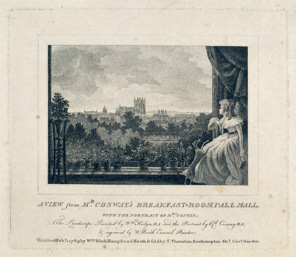The miniaturist Richard Cosway worked hard to establish his position as a gentleman artists. His efforts included the print in figure 4, entitled A View from Mr Cosway’s Breakfast Room with the Portrait of Mrs Cosway, 1789. It shows Cosway’s wife seated beside a window (recklessly large for the British climate) in their house in a fashionable part of London.