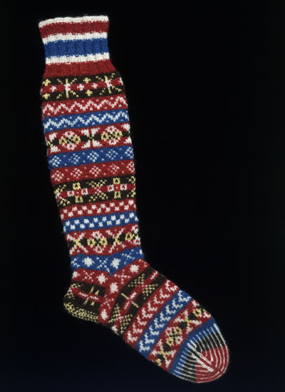 Men and women knitted as they went about their daily errands, supporting the knitting in a sheath secured to their waist. People would also gather for knitting ‘parties’. These were evening occasions where people told stories and sang, as well as continuing with their work. There were also knitting schools, which taught the skill to children from an early age, training them to sing songs to accompany their work.