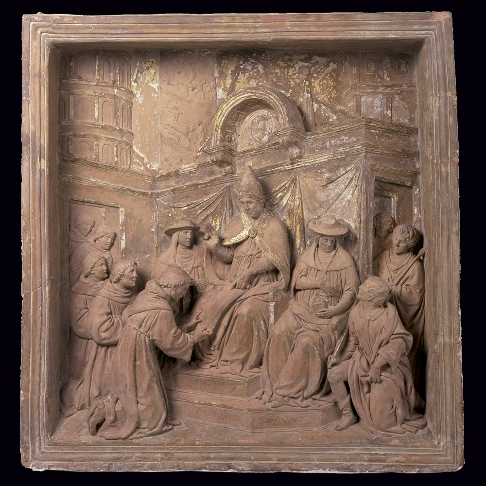 Terracotta pulpit relief depicting Pope Honorius III confirming the establishment of the Franciscan Order, by Benedetto da Maiano, Italy, about 1480-81. Museum no. 240:1-1889