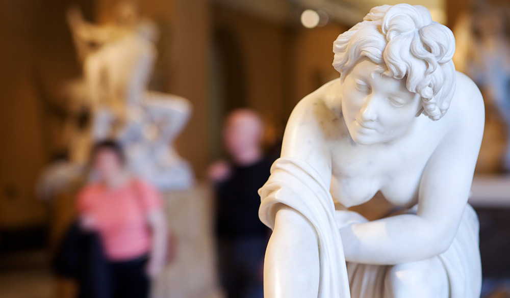 In the 18th and 19th centuries sculpture was often displayed in the orangery of a country house, or in a special sculpture gallery. This gallery, with views of the garden outside and daylight coming through the doors and windows, recalls those traditional methods of display.