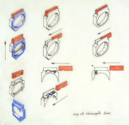 Joël Degen, 1975-6. Designs for rings in metal with interchangeable stones, showing constructional detail. Museum no. CIRC.371-1976