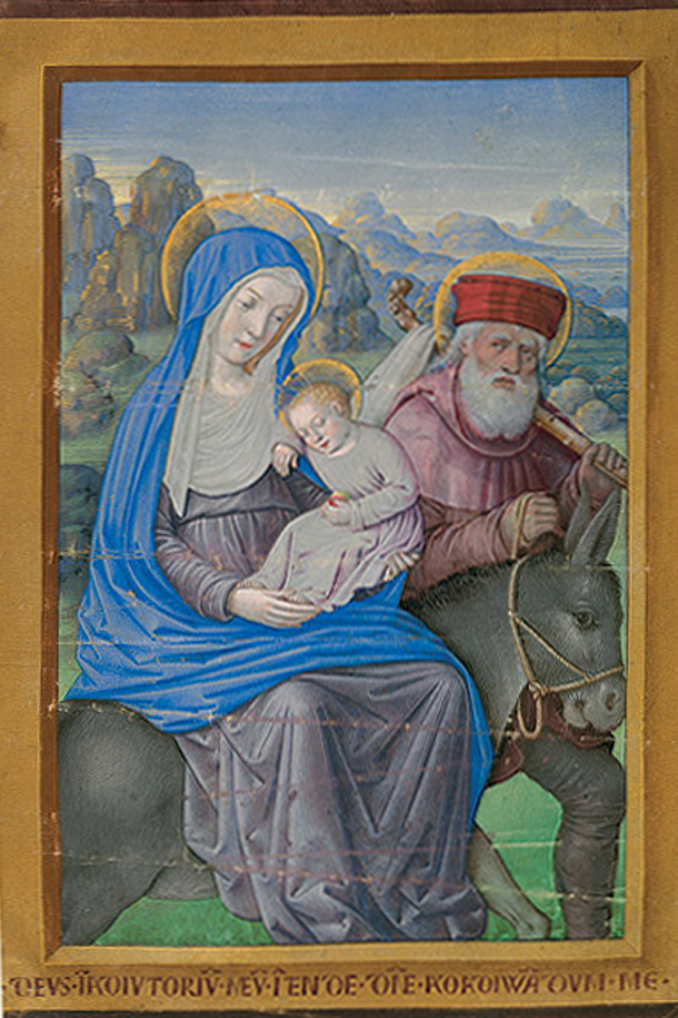 'Flight into Egypt', illuminated manuscript from the Book of Hours of Louix XII by Jean Bourdichon, 1498/9, France. From a private collection, courtesy of Sam Fogg, London.