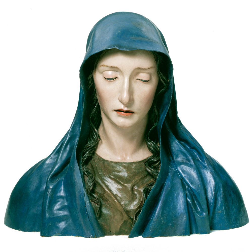 Busts of the sorrowful Virgin were often placed in the side chapels of churches as a focus of private devotion, perhaps alongside a similar bust of Christ displaying his wounds. The resigned anguish of the Virgin's expression on the de Moro sculpture, and the carving of her veil and ringlets (made from twisted wood shavings) are particularly skilful and affecting.
