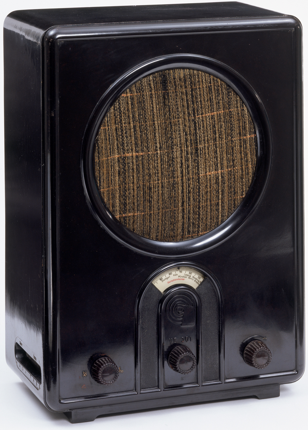 'Volksempfänger radio VE 301 W', Walter Maria Kersting (1889–1970), Germany, 1933, bakelite case and linen speaker cover. Museum no. W.7–2005