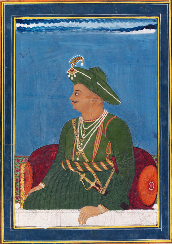 The city was a sight to wonder at, with its palaces mosques and minarets and its Hindu Temples. One of the grandest buildings with an impressive bulbous dome is the tomb Tipu built for his father Haider Ali. It' s now possible to reconstruct something of the exotic magnificence of Tipu's court. Here he is pictured outside the Lal Bagh Palace with his elephants which were taught to kneel before him. The elephants saddles varied from the relatively plain to the most sumptuous embroidered objects, and of course Tipu and Haider on state occasions would have travelled in howdahs almost big enough to double as bandstands. Tipu rose early donning a fine white Muslim gown or Jarma and in the lining of his draws he had a pocket in which he kept a European watch, this like his cane and so many other personal effects was among the objects found when Seringapatam finally fell. Of several portraits of Tipu , that by George Cherry, secretary to Cornwallis is the most famous. It shows him a little corpulent, heavily bejewelled and wearing the broad flat turban which he generally favoured.