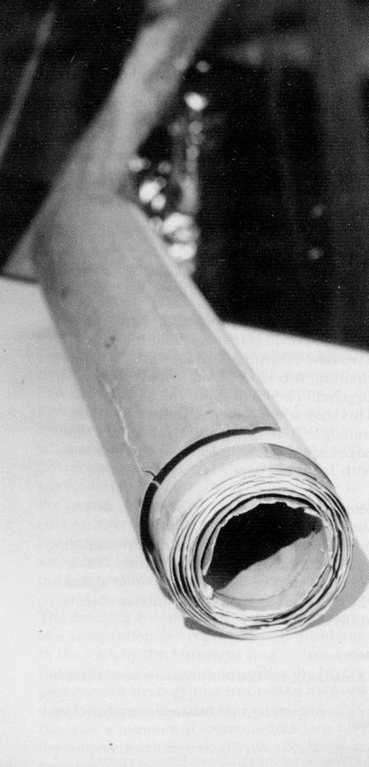 The survey showed that the object measured some 25cm in diameter by 68cm wide (Fig.1). It was in poor physical condition, embrittled and discoloured, with fragments detached at the edges and with surfaces exposed and covered in fine sooty dirt. Furthermore it was uncertain as to whether the traced images were supported by any backing paper.